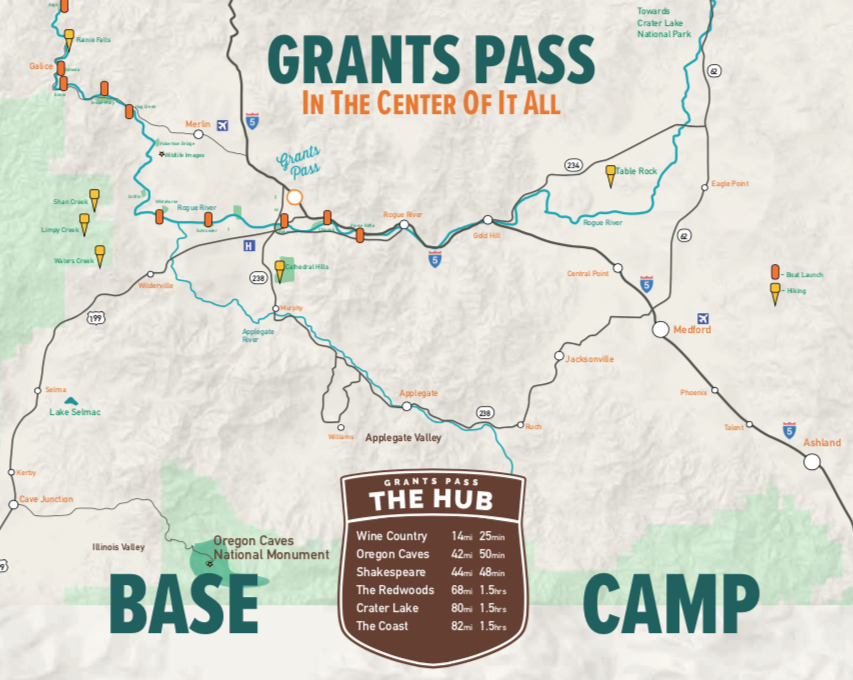 In addition to being located right on the Rogue River and surrounded by beautiful mountains, Grants Pass is also a short distance from many natural wonders and attractions. Just 42 miles from the Oregon Caves, 44 miles from The Oregon Shakespeare Festival, 68 miles from The Redwoods, 80 miles from Crater Lake, and 82 miles from the Coast, Grants Pass is a great spot to “set up camp” and explore.